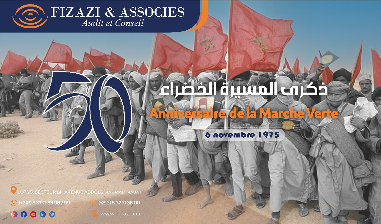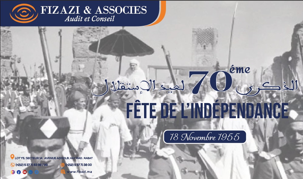 A l'occasion du 24 éme anniversaire de l'intronisation de Sa Majesté le Roi Mohammed VI,l'équipe de la Firme FIZAZI & ASSOCIES. a l'honneur de présenter ses voeux les plusrespectueux de bonheur et de longue vie à Sa Majesté le Roi Mohammed VI. à Son AltesseRoyale Moulay El Hassan, à Son Altesse Royale le Prince Moulay Rachid et à tous lesmembres de la famille royale.